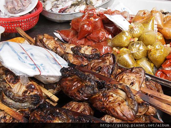 剛剛的耳機女孩一派輕鬆的把蒸魚撲在香蕉葉和報紙打包,動作顯得隨性有節奏,那個魚的味道聞起來很腥,不知嚐起來如何?