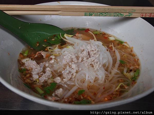 我在最靠近搭船點的地方叫了一碗米粉湯25Bat,右下角的水似乎從別處載來使用,有經過過濾,不過還是看起來綠綠的